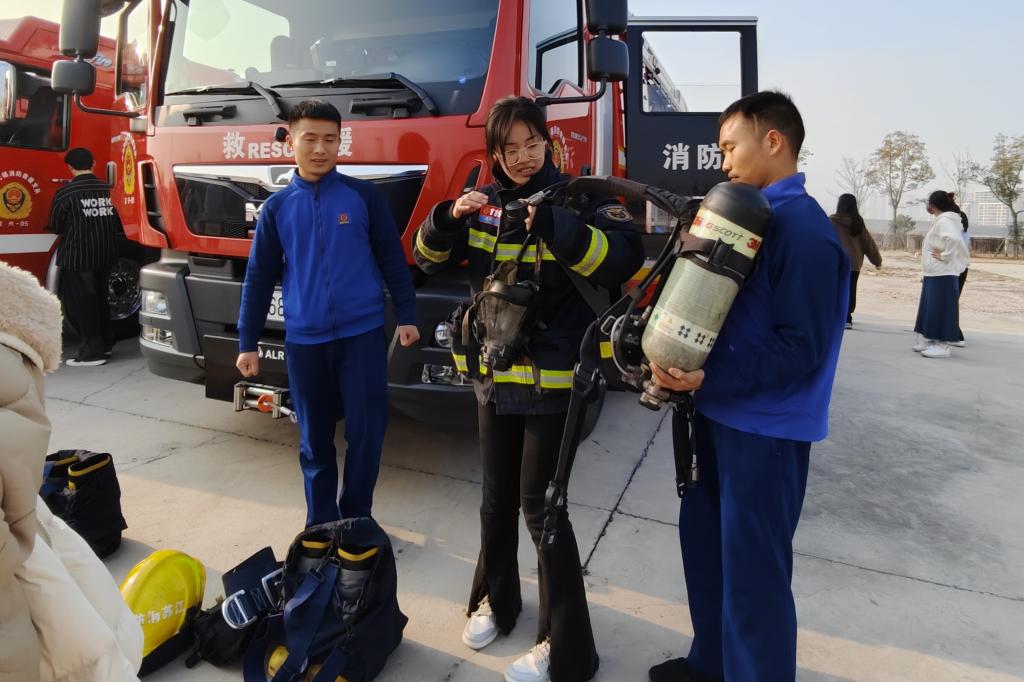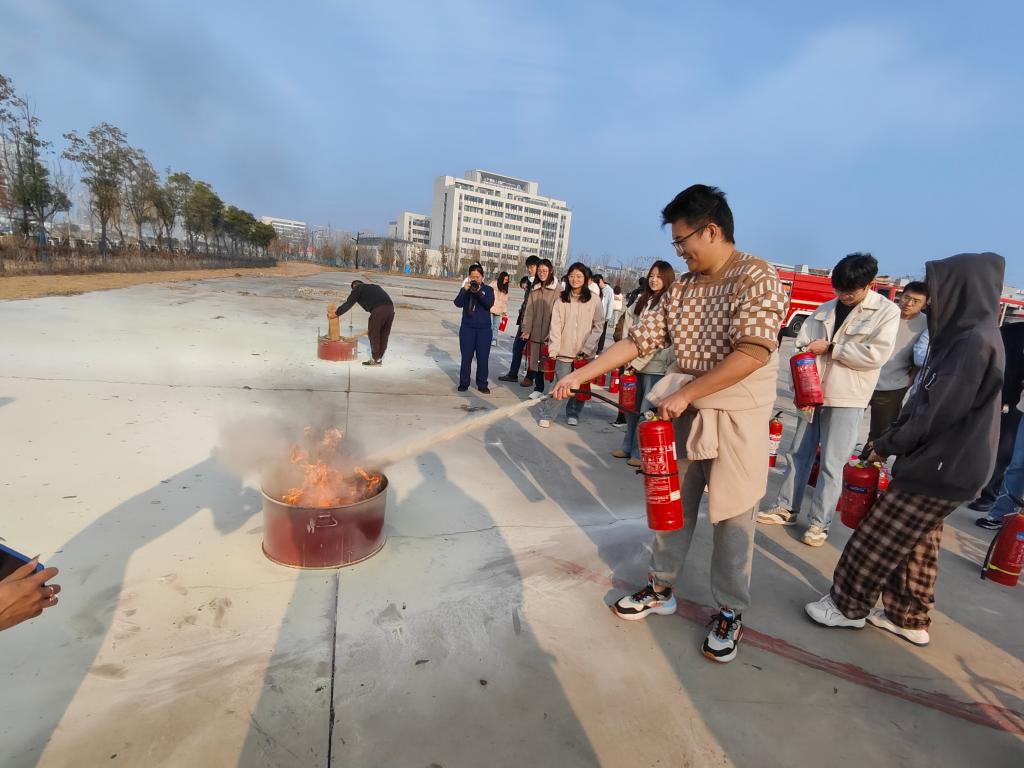 学校消防维保单位负责人,带领学生进行灭火、烟雾逃生等模拟训练,将知识性和趣味性融为一体。消防救援大队官兵,为学生讲解现场消防水泡车、应急救援车的结构和功能、装备的使用,并让学生上车实际体验,同学们兴致盎然。在灭火演练场地,官兵们讲解了有关火灾现场的应急处置,灭火器的使用原理以及相关的注意事项,牢记灭火关键步骤和要领。在认真听讲及观摩后,参加演练的师生分批亲自体验了现场灭火的过程,面对熊熊燃烧的火堆,教师和学生们表现得十分沉着,熟练地按照灭火的步骤和方法,将汽油燃起的浓烟大火成功的迅速扑灭。最后,消防救援大队官兵还到访了知行楼实验室、宿舍区等人员密集、消防安全重点场所部位,实地查看校区消防设施条件建设和物资配备情况,为学校消防安全工作把脉,加强学校和地方的交流合作。