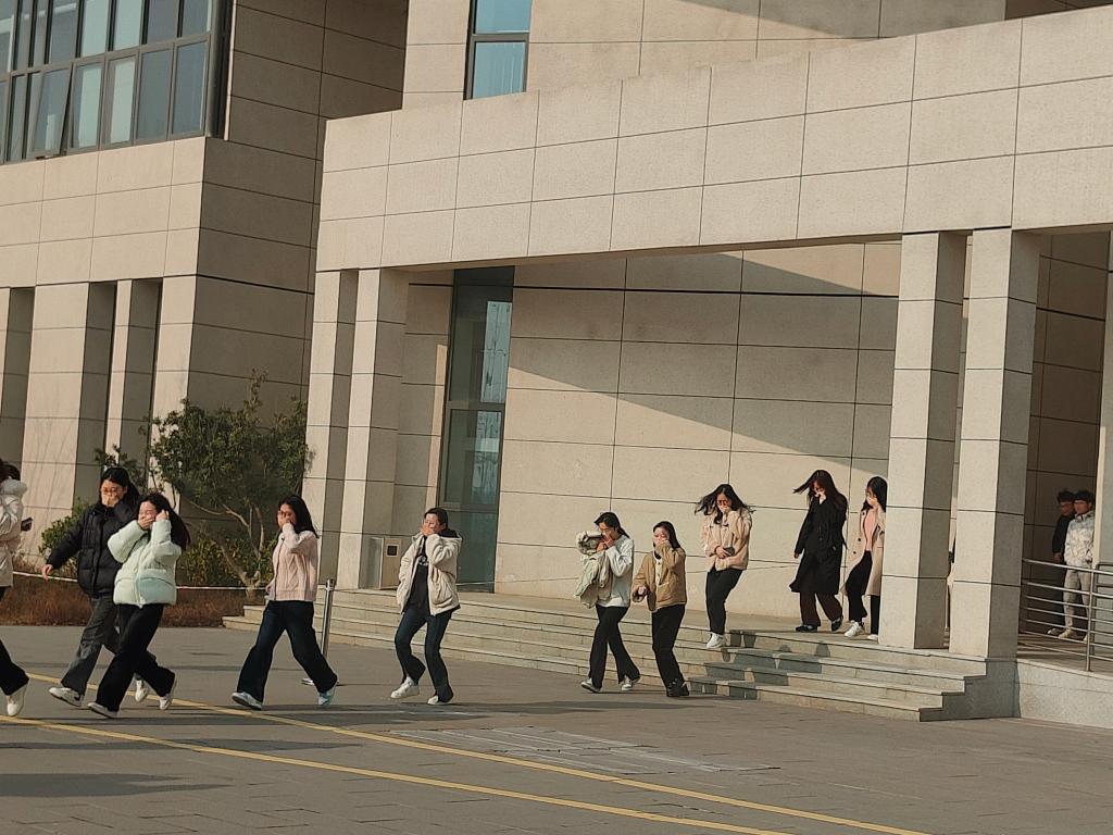 当天下午,随着知行楼烟幕弹释放,应急逃生演练开始。实验楼各楼层火灾警示广播声响起,实验室内学生迅速停下工作,井然有序地撤离到一楼指定疏散集合点,清点人数后集体步行前往南门大停车场,与环境与生态学院师生汇合后共同进行后续消防演练。活动现场,张一波简要介绍应急演练活动的主要内容,并介绍到场的领导和嘉宾。赵爱军发表讲话,他强调,安全是学校一切工作的“压舱石”,而实验室安全是校园安全的重要组成部分,广大师生要长鸣安全警铃,提高安全意识,掌握应急技能,牢守安全底线。随后,顾志国宣布应急演练正式启动。