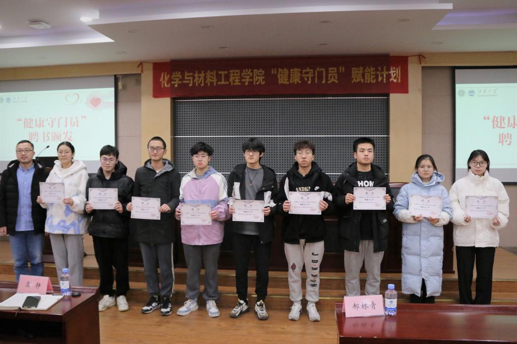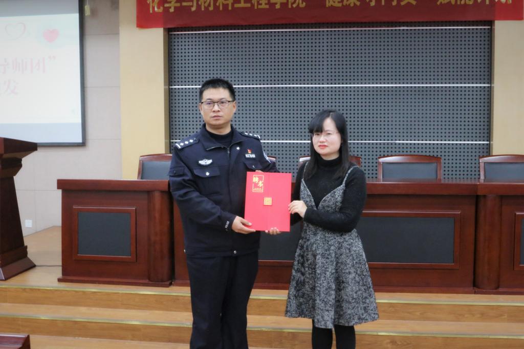 董霞首先为康伟锋颁发化工学院“校外树人导师团”聘书,为参会学生代表颁发“健康守门员”聘书。