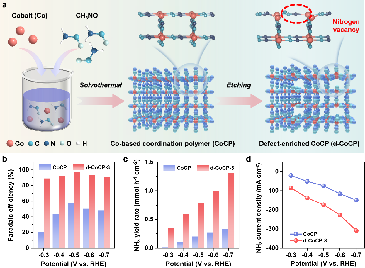 针对上述问题,我们开发了一种富含缺陷的配位聚合物催化剂,该催化剂具有不饱和配位结构的金属单原子活性位点,能显著促进硝酸盐的吸附与转化,实现硝酸盐电还原制氨活性和选择性的提升。配位聚合物催化剂由单原子金属中心与有机配体通过配位键组成,由于金属中心和有机配体种类的多样性,使得其具有良好的可调节性。如图1所示,我们以钴为例,通过对钴基配位聚合物(CoCP)进行甲醇蚀刻处理,成功合成了富含缺陷的钴基配位聚合物(d-CoCP)。电化学测试结果显示,d-CoCP催化剂表现出优异的硝酸盐电还原制氨活性和选择性,其在电流密度为173.3 mA cm⁻2时,氨产率达到0.78 mmol h⁻1cm⁻2,法拉第效率高达97%,性能远高于CoCP催化剂。本工作表明了富含缺陷的钴基配位聚合物作为一类催化剂在硝酸盐电还原制氨领域具有较大的潜力,促进了配位聚合物材料的基础研究,也为高性能硝酸盐电还原制氨催化剂的合理设计提供了有益借鉴。