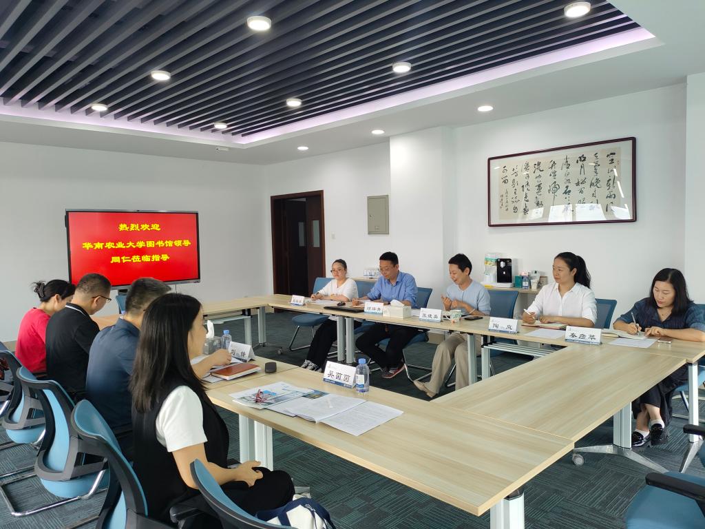 为科学谋划“十五五”发展蓝图,学习交流先进经验,5月19日下午,华南农业大学图书馆馆长刘峰、资源建设部部长王中海、流通阅览部副部长黄华艳、系统部副研究馆员吴茵茵一行赴江南大学图书馆开展专题调研。图书馆、档案馆党总支书记张婕英、副馆长顾烨青及对口部门负责人参加交流。会议由张婕英主持。