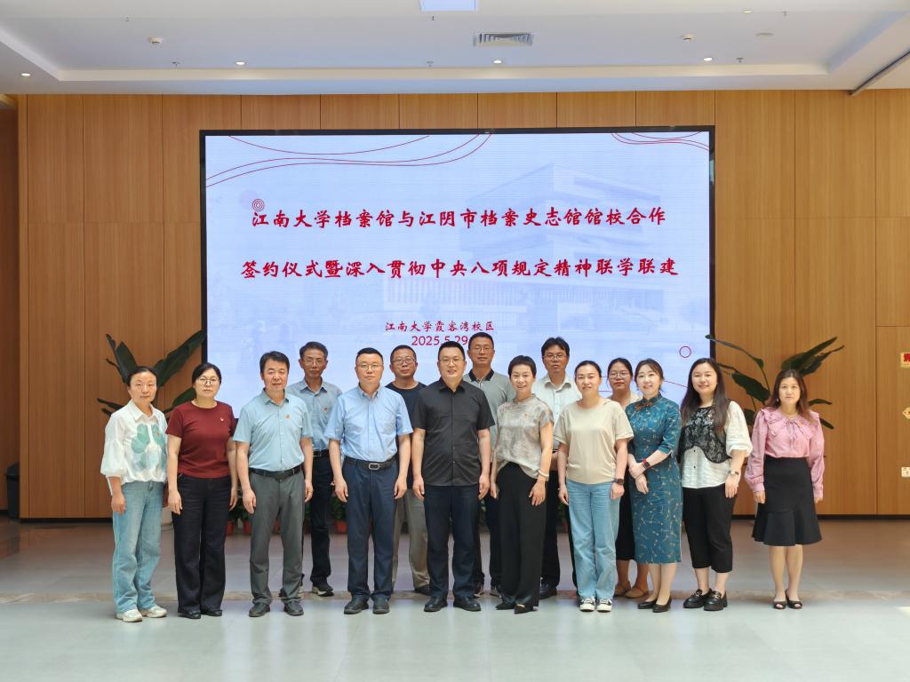 5月29日,档案馆与江阴市档案史志馆于霞客湾校区图书馆举行馆校合作签约仪式。江阴市档案史志馆现场捐赠《江阴通史》《江阴抗战档案史料汇编》等珍贵文献,并设立方志文化驿站,搭建校地档案资源共享新载体。双方就深入贯彻中央八项规定精神学习教育开展联学共建,通过专题党课讲授、典型案例剖析等环节,将党纪教育与档案收集、保管、利用等专业工作有机融合,形成“党建引领业务,业务淬炼党建”的良性发展格局。