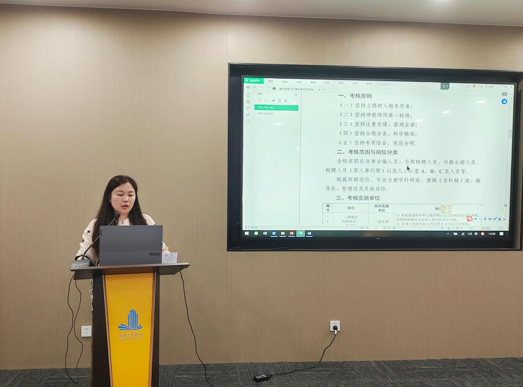 首先,馆长陈敬华介绍了《考核办法》的制定背景与制定过程。他指出,根据《江南大学关于深化教职工年度考核工作的实施意见》要求,两馆结合自身实际,在经过充分讨论、征求意见的基础上制定了本办法,旨在充分发挥考核的激励导向作用,激发教职工队伍创新活力,推动两馆事业高质量发展。