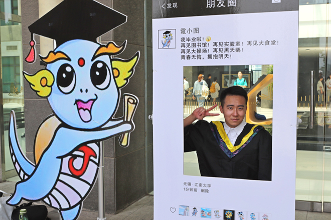 “点赞母校 共同成长”,把四年的回忆照片贴到毕业墙上,把临别赠言写在毕业墙上,让多彩的印泥代表多姿的心意,在毕业墙上为母校和自己点赞!同学们纷纷点赞母校的一草一木,一砖一瓦,留恋校园的樱花林、曲水桥、北操场、小蠡湖……。希望毕业生们在毕业墙下不仅仅留下美丽的身影,更要带走毕业墙寄予的深意,在未来的道路上,孜孜以求,不断前行。