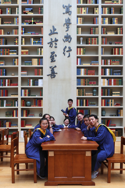 “书山驻足 亲友寄语”,图书馆结合当代95后大学生的年轻心态,在图书馆东大门口设置了个性朋友圈和可爱小鼋君拍照打卡神器,毕业生们或同学相伴、或班级组团、或亲友相邀,随着按下相机的瞬间,定格了他们最美好的青春时刻。内庭书墙上的“笃学尚行,止于至善”校训,也无时无刻不在激励着我们的江大人。