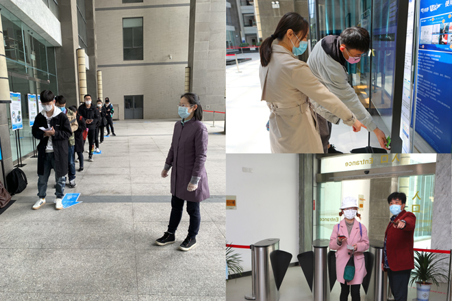 疫情防控期间图书馆通过在线方式为师生提供全方位的读者服务和科研服务保障,实现了闭馆不闭网,“智慧服务”永在线。开学前期,根据疫情防控的工作要求,周密细致地研究制定开放方案,从读者进馆流程设计、人流管控、卫生防疫、设备保障和人员安排等方面,把各项准备工作和防疫要求落实落细。市、校两级领导多次现场指导,进一步提出优化方案,多方协同,营造安全有序的环境迎接读者入馆。