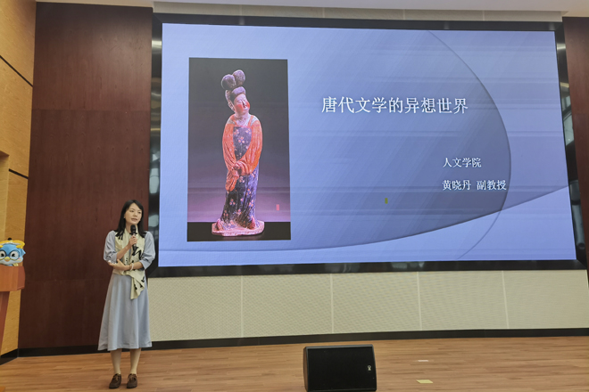 本次讲座由人文学院副教授黄晓丹主讲,她分享的主题是“唐代文学的异想世界”。讲座伊始,黄晓丹谈了她以及她的文人朋友对宜兴美好的印象。讲座中她结合自身丰富的诗学经验及深邃的学术见解,从李白的《清平调词三首》《秋浦歌》《感遇》等诗歌说起,通过诗歌里描绘的精美器物、珍奇异兽、奇花异果、建筑等打开了听众透过诗词探索唐朝社会的大门,去确认在那个伟大浪漫的时代,大量的舶来品通过丝绸之路,海上丝绸之路进入中国,让听众看到唐朝社会的开放与自信,感受到千百年前大唐的繁荣与诗人的辽阔和对国家的自豪。如今党的二十大的胜利召开,我们身处于一个更伟大的时代,唐代的“异想”在今天许多早已变成现实,而更多的“异想”将通过我们的努力在将来变为现实。
