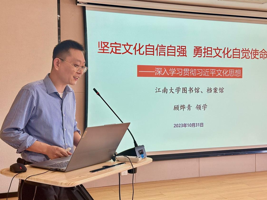 副馆长顾烨青作《坚定文化自信自强 勇担文化自觉使命——深入学习贯彻习近平文化思想》专题领学,带领馆员系统学习了习近平文化思想的丰富内涵、核心要义和实践要求。他指出,习近平文化思想明体达用、体用贯通,明确了新时代文化建设的路线图和任务书,标志着我们党对中国特色社会主义文化建设规律的认识达到了新高度,表明我们党的历史自信、文化自信达到了新高度,为做好新时代新征程宣传思想文化工作、担负起新的文化使命提供了强大思想武器和科学行动指南。随后,他从抗战期间图书馆人誓死转移保护文澜阁《四库全书》,九年漫漫文化长征路上所彰显的民族精神,古史辨派的创始人、曾就职北大图书馆、中山大学图书馆的顾颉刚先生《购求中国图书计划书》等史实,投射到当下,两馆全套典藏国家级重大文化工程成果《中国历代绘画大系》和正在举办的“盛世修典”大系成果展巡展,这正是我们深入学习贯彻习近平文化思想,传承和弘扬中华优秀传统文化,推动中华优秀传统文化创造性转化、创新性发展,充分体现文化自信的一次生动实践。他激励两馆馆员要以此为契机,主动担负起中华文化薪火的守护者、传承者和推广者的使命与责任,切实履行《图书馆服务宣言》,在赓续中华优秀传统文化、践行文化自信之路上发挥应有的作用。