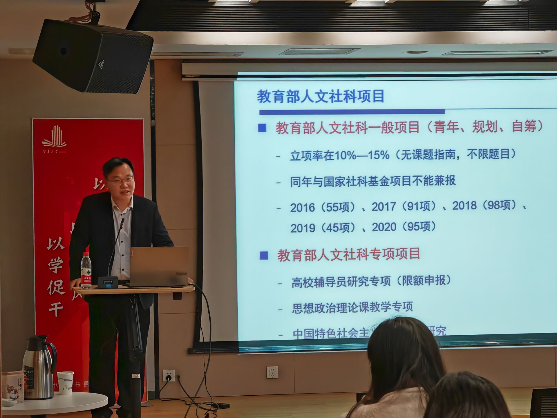 潘加军围绕高水平项目申报的突破点、申报书的写作技巧和对于科研能力培育的理解等方面分享了其宝贵经验。他以个人教育部人文社会科学研究一般项目申报书为范例,聚焦申报书撰写的各项内容,就如何选题、研究理论价值和应用价值、研究现状述评、研究内容框架和重点难点、创新之处、研究思路与研究方法等的书写进行了详细讲解,鼓励大家要提高项目申报的自信心,多思考、多总结、多尝试,不断培育科研能力,积极申报高层次项目和课题。