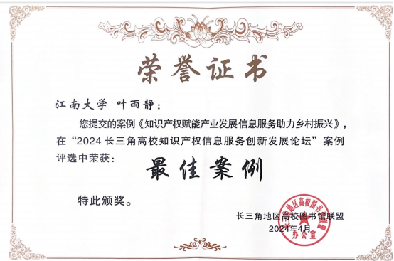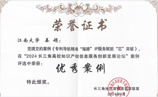4月18日-20日,由东华大学、长三角G60科创走廊联席会议办公室、长三角高校图书馆联盟联合主办的“2024长三角高校知识产权信息服务创新发展论坛”在东华大学松江校区举行。会议以“创新知识产权信息服务,助力高校专利高质量转化”为主题,旨在提升长三角高校知识产权公共服务能力,大力推动高校专利转化。我校高校国家知识产权信息服务中心副主任张群研究馆员应大会邀请,作了“知识产权信息服务赋能产业创新发展”的主题报告,详细介绍了江南大学知识产权信息服务中心的基本概况、特色工作、产业服务案例等。重点强调了专利导航工作在高校科研、区域产业发展和政府决策支持中的重要作用。我校报送的知识产权信息服务案例《知识产权赋能产业发展,信息服务助力乡村振兴》获最佳案例,《专利导航精准“指路”,IP服务赋能“芯”突破》获优秀案例,并进行了现场交流分享。