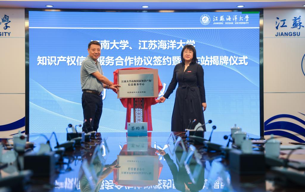 陈敬华和艾华共同为江南大学高校国家知识产权信息服务中心江苏海洋大学工作站和江南大学江苏省专利导航服务基地江苏海洋大学工作站揭牌,并签署了合作协议。