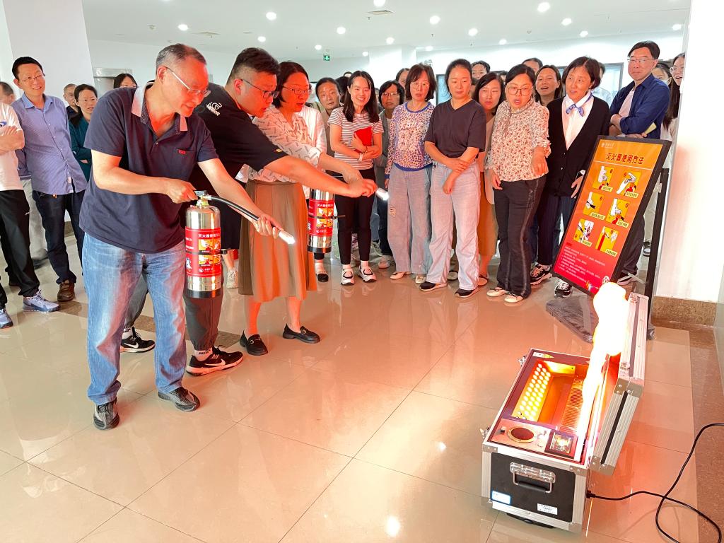 讲座结束后,全体参训人员在图书馆十楼大厅进行了实战模拟演练。王世强科长现场演示了灭火器的使用方法,全体参训人员积极响应,有序进行实操体验。