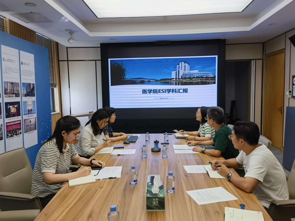 ESI基本科学指标数据库是衡量高校学科发展水平的重要参照。交流会上,张娣首先从机构排名、发文总量与总被引频次、高被引论文与热点论文等多方面以详实严谨的数据展示了近一年医学院ESI临床医学总体绩效水平及各二级机构对ESI临床医学的贡献度;同时,现场演示了ESI数据库各模块及“江南大学ESI与学科服务动态”平台内容及使用方法,并特别介绍了ESI前沿内容,助力探索新领域。潘礼龙教授对图书馆的工作及主动服务给予高度肯定,双方围绕医学相关学科的ESI排名分析、论文质量对ESI的贡献度、可能进入ESI前1%的医学潜力学科、自然指数数据分析等问题进行深入探讨和交流。