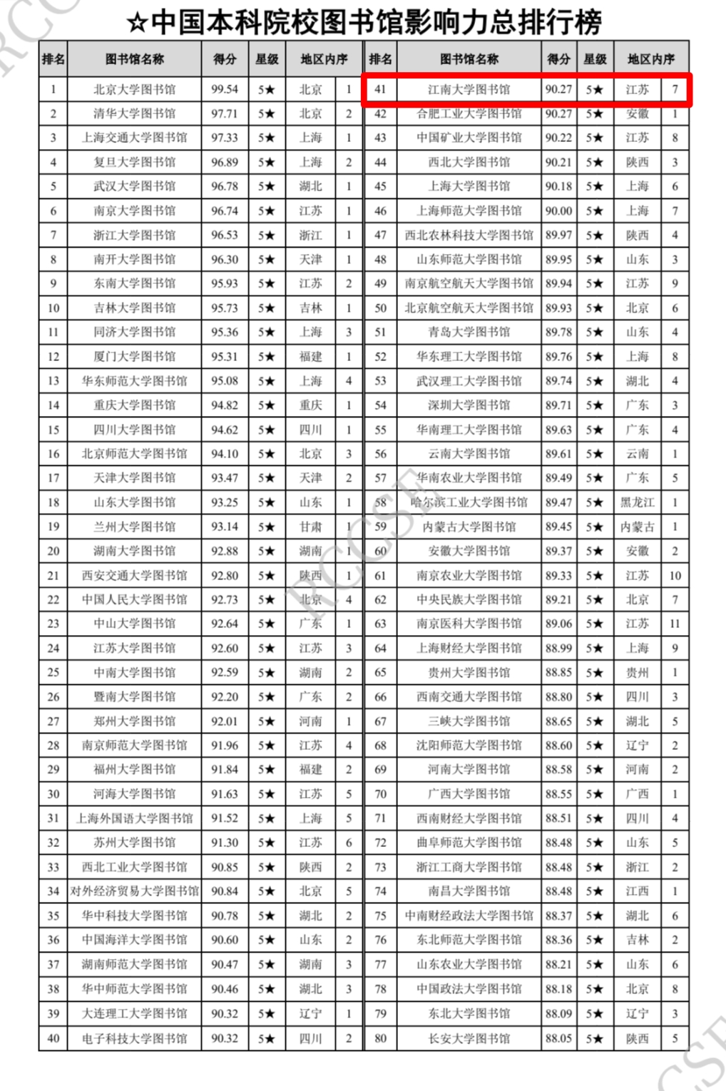 日前,在武汉大学中国科学评价研究中心、中国科学与科技政策研究会科学计量学与信息计量学专业委员会联合发布的《数智时代中国图书馆影响力评价报告(2024版)》中,江南大学图书馆在全国2820所普通高校的图书馆中力创佳绩,在中国双一流高校本科院校图书馆影响力总排行榜中位列第40名,在全国本科院校图书馆影响力总排行榜位列第41名,荣膺五星级图书馆。其中,在高校图书馆学术影响力百强排行榜高居第13名,得到业界的良好赞誉。