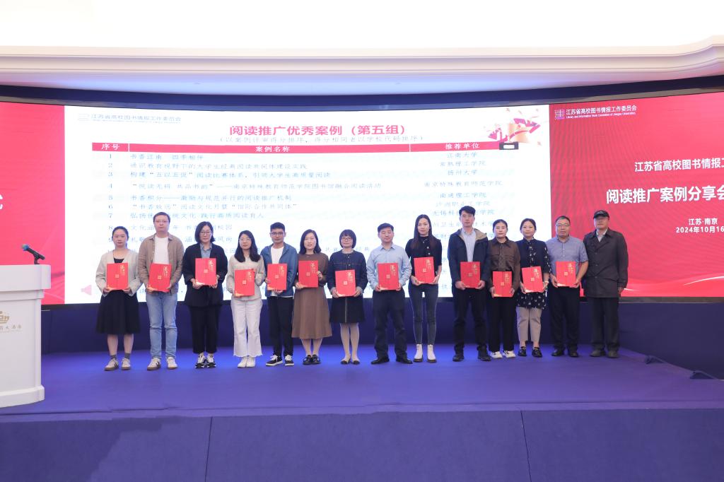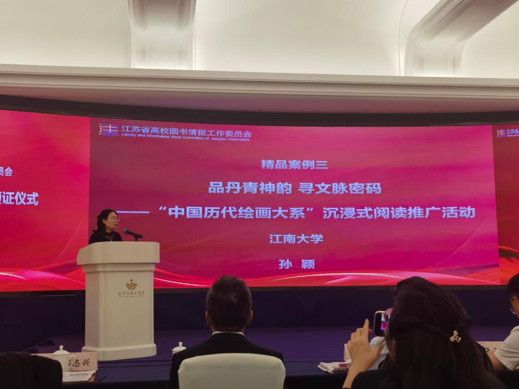 10月16日,江苏省高校阅读推广优秀案例分享会暨颁证仪式在南京召开。我校图书馆报送的《品丹青神韵 寻文化密码——“中国历代绘画大系”沉浸式阅读推广活动》《书香启航,鼋梦江南——阅读推广大使赋能高质量阅读》《书香江南 四季相伴》三项案例获评“优秀案例奖”。会上,图书馆副馆长孙颖作为优秀案例代表做汇报交流。