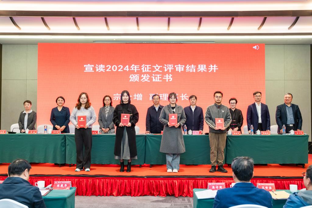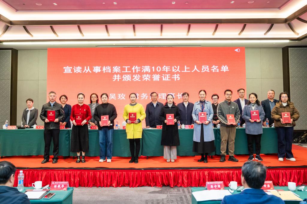 江苏省高校档案研究会副理事长宗士增宣读了2024年征文评审结果和从事档案工作满10年以上人员名单,主席台嘉宾为相关同志颁发了证书。