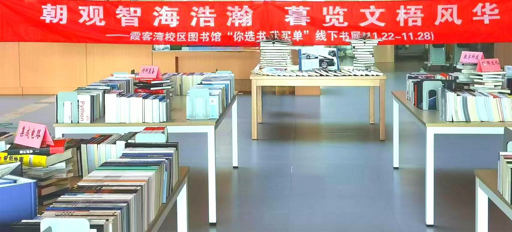 为满足广大师生多样化的阅读需求,营造良好的校园文化氛围,进一步提高馆藏资源与新校区学科的匹配度,11月22日—28日,江阴霞客湾校区图书馆迎来了一场别开生面的文化盛宴——“你选书,我买单”线下书展及“可知”电子书线上荐书节。此次活动在图书馆二楼大厅举办,吸引了众多师生踊跃参与。