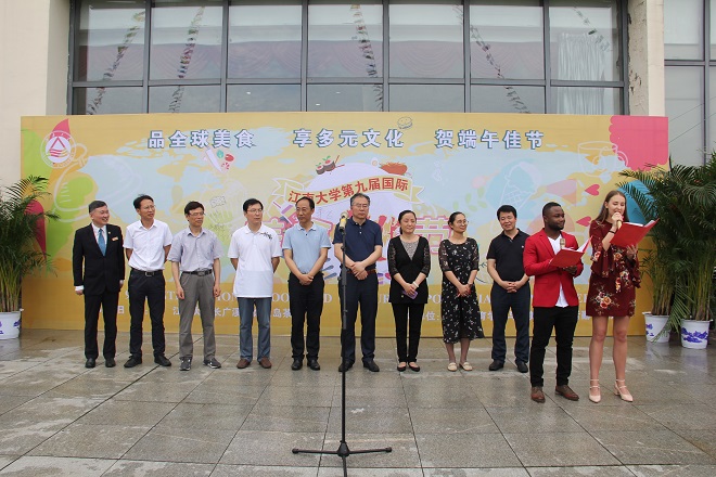 六月的江南,树木葳蕤、芳草碧绿。6月6日中午,江南大学第9届国际美食文化节在长广溪宾馆绿岛茶园隆重开幕。党委办公室主任朱飞、校长办公室主任张光生、工会主席冯群康、后勤管理处处长方正泉、国际教育学院与北美学院党委书记高雪梅,宣传部、学工处等职能部门负责人,以及中外留学生代表约300人出席此次开幕仪式。