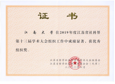 江苏省社科界学术大会是我省规模最大、规格最高的学术交流平台。省社科大会优秀组织奖是省委宣传部、省社科联对承办学术大会组织工作的单位进行的评优与表彰。2019年11月,我校成功承办了江苏省第十三届哲学社会科学大会“文学与历史学”专场。专场学术大会活动方案周全,主题演讲专家层次高,演讲内容紧扣主题,论文组织工作到位,获得专家学者与上级主管部门的高度认可。这次获奖也是继2014年、2017年两次获得“江苏省社科界学术大会优秀组织奖”后,我校第三次获得优秀组织奖的殊荣。