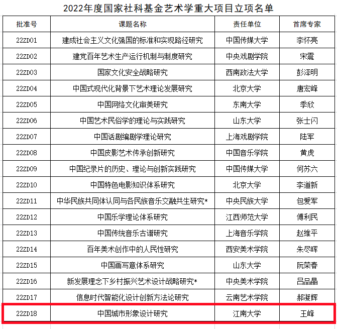 6月29日,全国艺术科学规划领导小组办公室公布了2022年度国家社科基金艺术学重大项目立项名单,我校设计学院王峰教授领衔申报的“中国城市形象设计研究”喜获立项。这是我校首次获批国家社科基金艺术学重大项目,标志着我校在该领域实现了新的突破。