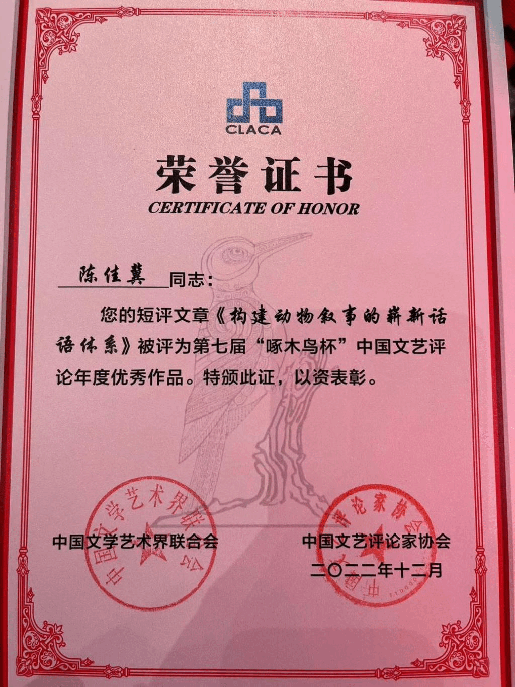 1月13日,由中国文学艺术界联合会、中国文艺评论家协会主办的第七届“啄木鸟杯”中国文艺评论推优暨第三届网络文艺评论优选汇云发布典礼举行。我校人文学院副教授陈佳冀的短评文章《构建动物叙事的崭新话语体系》喜获第七届“啄木鸟杯”中国文艺评论年度优秀作品。