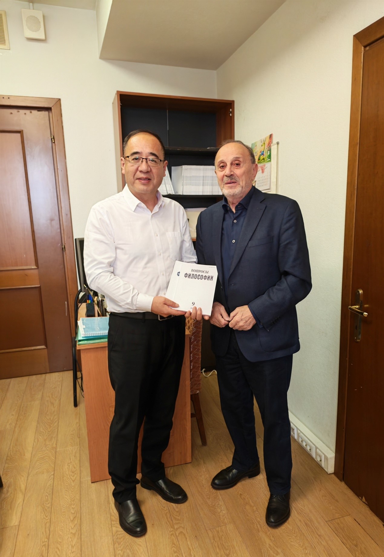俄罗斯科学院哲学研究所自然科学哲学研究室主任、《哲学问题》杂志主编鲍里斯·普鲁日宁(Борис Исаевич Пружинин)教授亲切会见了万长松教授一行并互赠礼物。万教授向普鲁日宁教授详细地介绍了江南大学的概况、规模和教学科研情况,特别是自2021年国家社科基金重大项目立项以来取得的进展和存在的问题,普鲁日宁教授深感兴趣并对中国学者所做的工作表示敬意。他详细介绍了俄罗斯科学院哲学研究所的发展历史、取得的成就。特别指出早在苏联时期,哲学研究所在科学哲学、逻辑学等领域就取得了世界级的研究成果,涌现出凯德洛夫、科普宁、伊里因科夫、季诺维耶夫、列克托尔斯基等一批优秀的科学哲学家,带动了20世纪60年代苏联科学哲学的兴起和认识论转向。会谈结束以后,普鲁日宁教授还带领万教授一行参观了哲学研究所档案馆并赠送了最新出版的著作和杂志。