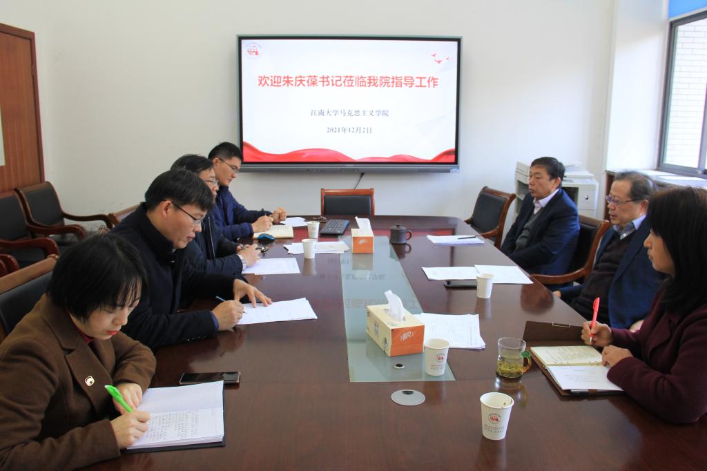 12月2日上午,校党委书记朱庆葆莅临马克思主义学院调研指导工作,学院党政班子成员参加了会议。