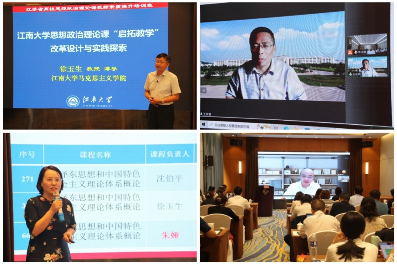 本次研修为期三天。研修期间,马克思主义理论研究和建设工程咨询委员会委员、教育部高校思政课总教指委副主任委员、天津大学马克思主义学院院长颜晓峰教授以“新征程谱写新篇章——学习习近平总书记在省部级专题研讨班上重要讲话精神”,江苏师范大学马克思主义学院院长曹典顺教授以“唯物辩证思维方式在毛中特课程中的教学方法与教学逻辑”,南京师范大学社会主义意识形态研究中心主任王永贵教授以“历史主动精神与新时代意识形态的历史性变革”,江南大学马克思主义学院院长刘焕明教授以“中国道路的艰难选择及其世界历史意义”,北京科技大学党委常委、宣传部部长彭庆红教授以“高校思想政治理论课实践教学的模式构建与质量提升”,江苏省特级教师、无锡市第一中学朱晴怡校长以“文脉涵养 课程育人——无锡一中‘大思政课’建设的路径探索”等为题分别做了精彩的主旨报告。在思政课程与“大思政课”建设专题研讨环节,教育部教学展示特等奖获得者、华东师范大学闫方洁教授以“如何讲好思政课的道理”,江苏省青教赛特等奖获得者、国家级重大人才工程青年项目入选者南京大学张明副教授以“讲深讲透讲活思政课”,江苏省教学改革成果特等奖获得者、江南大学马克思主义学院副院长徐玉生教授以“江南大学思想政治理论课‘启拓’改革设计与实践探索”,江南大学唐忠宝教授以“谈谈民主”,南京农业大学朱娅教授以“‘启拓教学’理念提升思政课建设成效”,“江苏省毛泽东思想和中国特色社会主义理论体系概论”分教学指导委员会副主任委员、中国矿业大学马克思主义学院院长亓光教授以“新时代思政课教学改革创新”等为题分别做了教学示范和专题报告。研修班还安排了全体学员赴江南大学思政课实践教学(宜兴)基地进行了现场教学。会议环节分别由刘焕明教授、徐玉生教授、侯勇教授主持,苏州大学马克思主义学院教师吉启卫等代表培训研修学员汇报交流了学习心得。