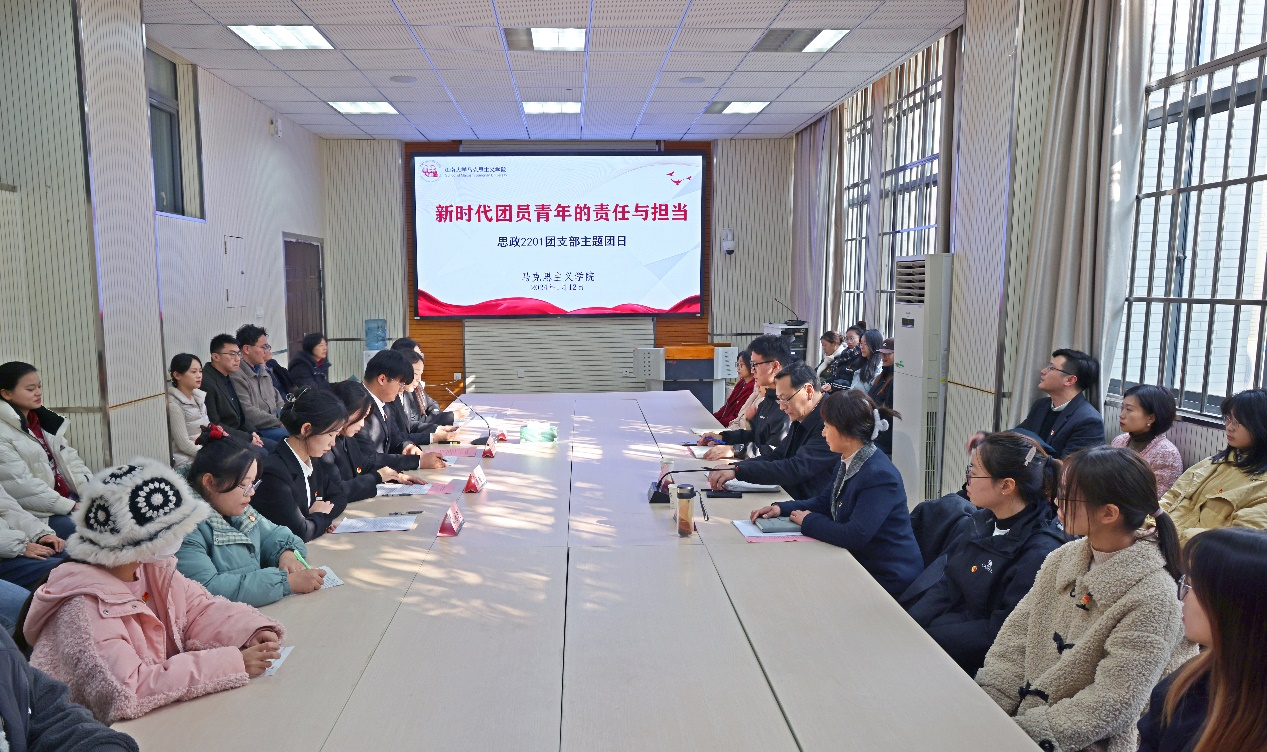 1月12日下午,马克思主义学院思政2201团支部举办“新时代团员青年的责任与担当”主题团日活动,校党委书记吴正国参加活动并讲话,学院领导班子成员、党委办公室有关负责同志陪同参与活动。活动由学院分团委朱雨萌同学主持。