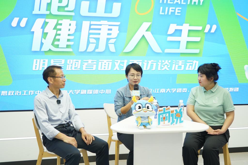 为进一步构建网络育人新生态,以强大思政引领力塑造立德树人新格局,5月10日下午,江南大学网络思政工作品牌“南说”发布仪式暨“奔跑的思政课”微访谈活动在学校融媒体中心举行。南京工业大学浦江学院思政老师向先,江南大学马克思主义学院教师、历史研究院副院长、教职工健步走协会会长、曲水桥跑团指导老师刘大禹,江南大学网络思想政治工作中心主任、融媒体中心主任兼党委宣传部副部长单筱婷出席活动。法学院辅导员缪晶晶主持活动。