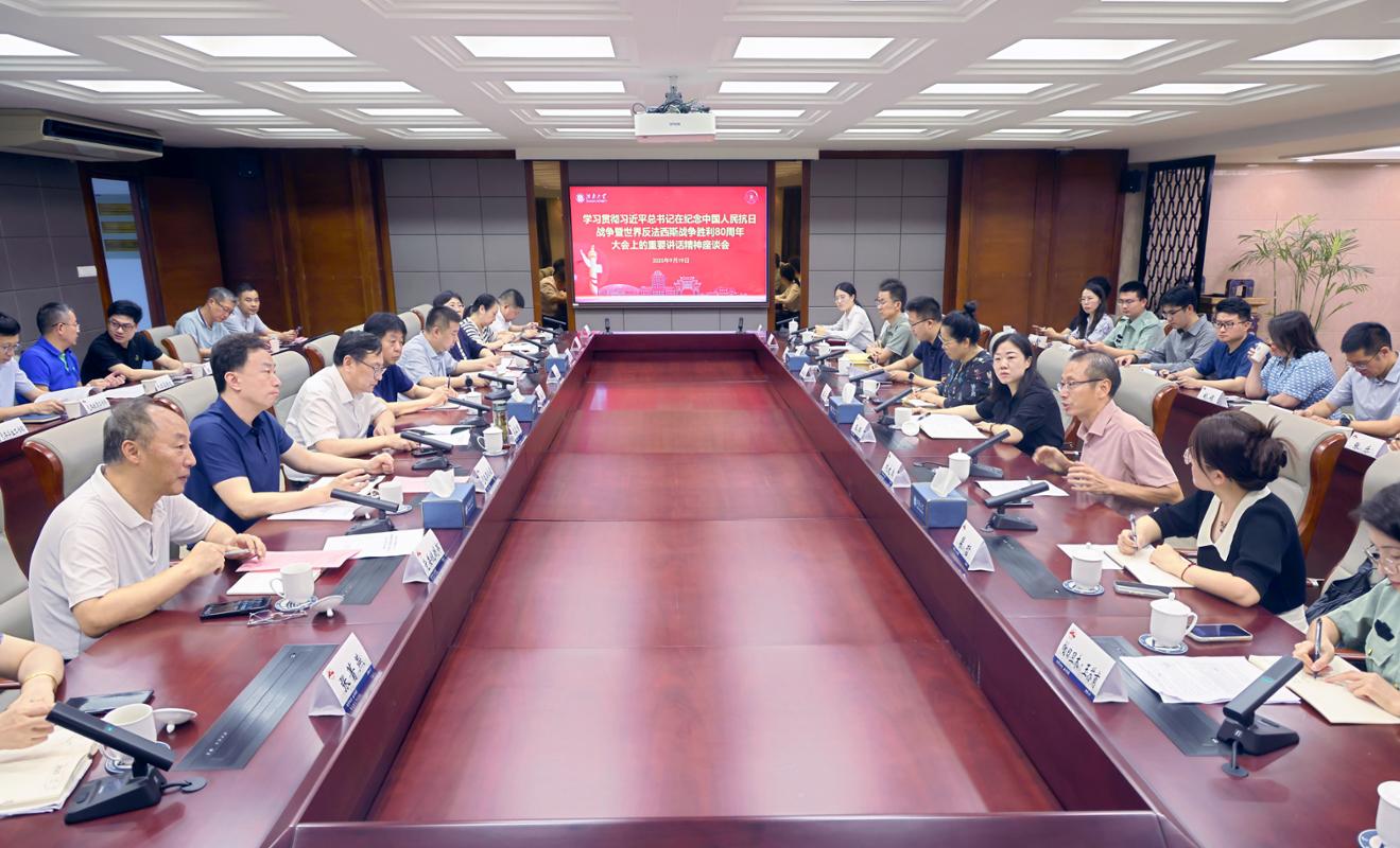 为深入学习贯彻习近平总书记在纪念中国人民抗日战争暨世界反法西斯战争胜利80周年大会上的重要讲话精神,传承和弘扬伟大抗战精神,铭记历史荣光,汲取奋进伟力,9月19日下午,学校在行政楼B305会议室召开学习贯彻习近平总书记在纪念中国人民抗日战争暨世界反法西斯战争胜利80周年大会上的重要讲话精神座谈会。校党委书记吴正国出席座谈会并讲话。校党委副书记倪松涛主持会议。校思想政治工作和思政课建设工作领导小组成员单位负责人参加会议,基层党组织书记、教师、辅导员、团员青年、退伍学生、民主党派代表围绕会议主题发言交流。