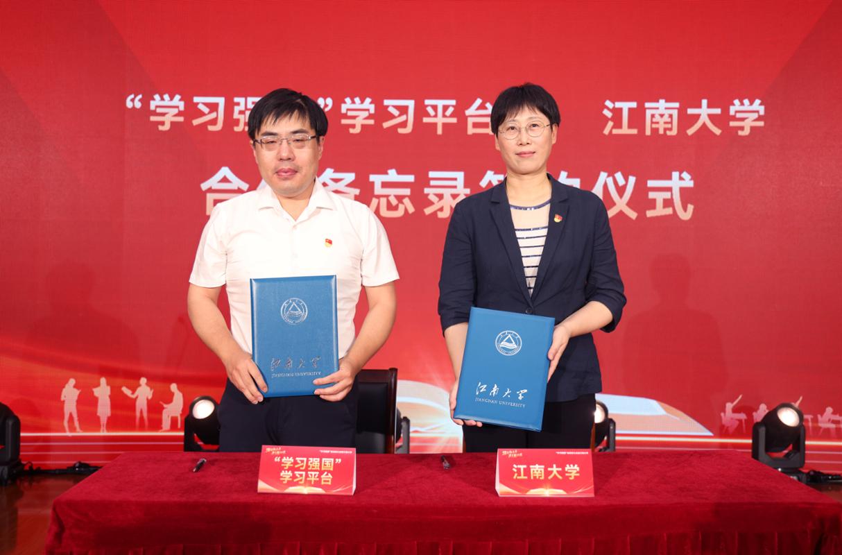 签约揭牌仪式上,史先振与江南大学党委宣传部部长李佳敏共同签署合作备忘录,并与江南大学融媒体中心主任兼党委宣传部副部长单筱婷共同为“学习强国”学习平台江南大学同学汇学生工作站揭牌。双方将围绕学生工作站共建、融媒资源共享、融媒人才共育等方面进一步加强合作,打造“学习强国”学习平台与校园融媒携手联动的“江南样本”。