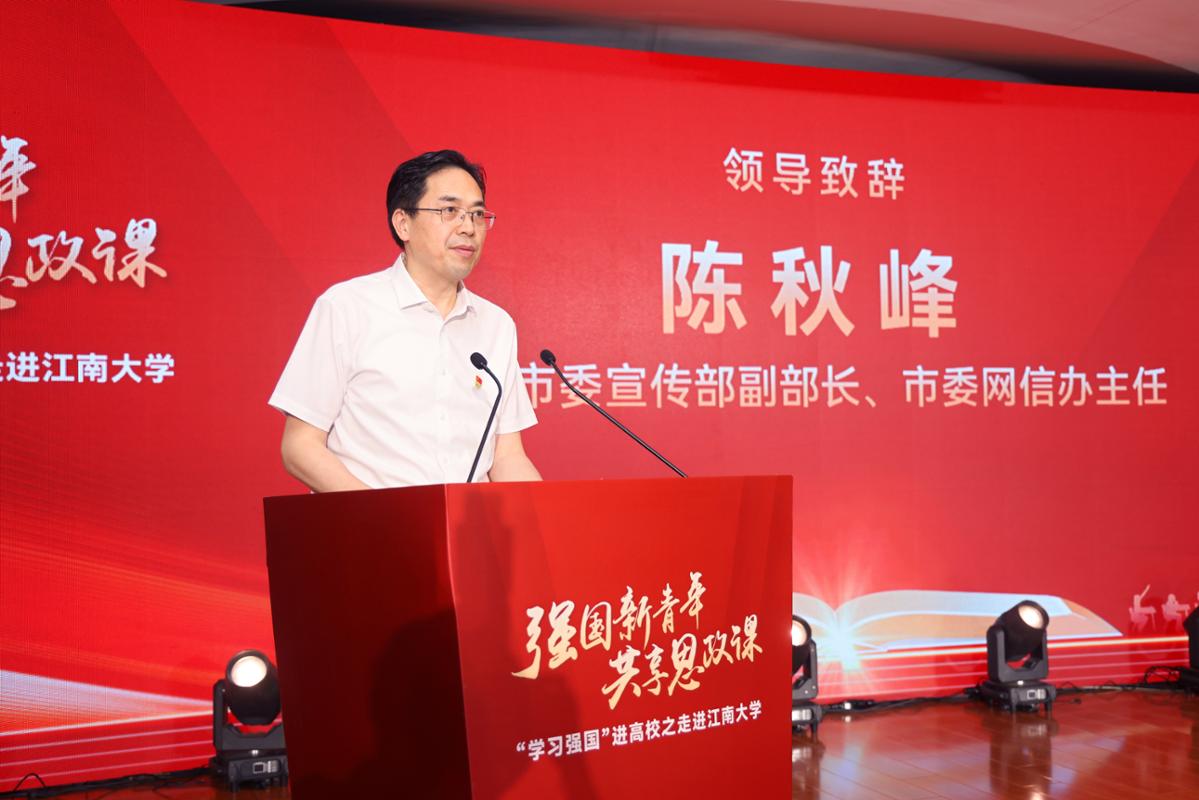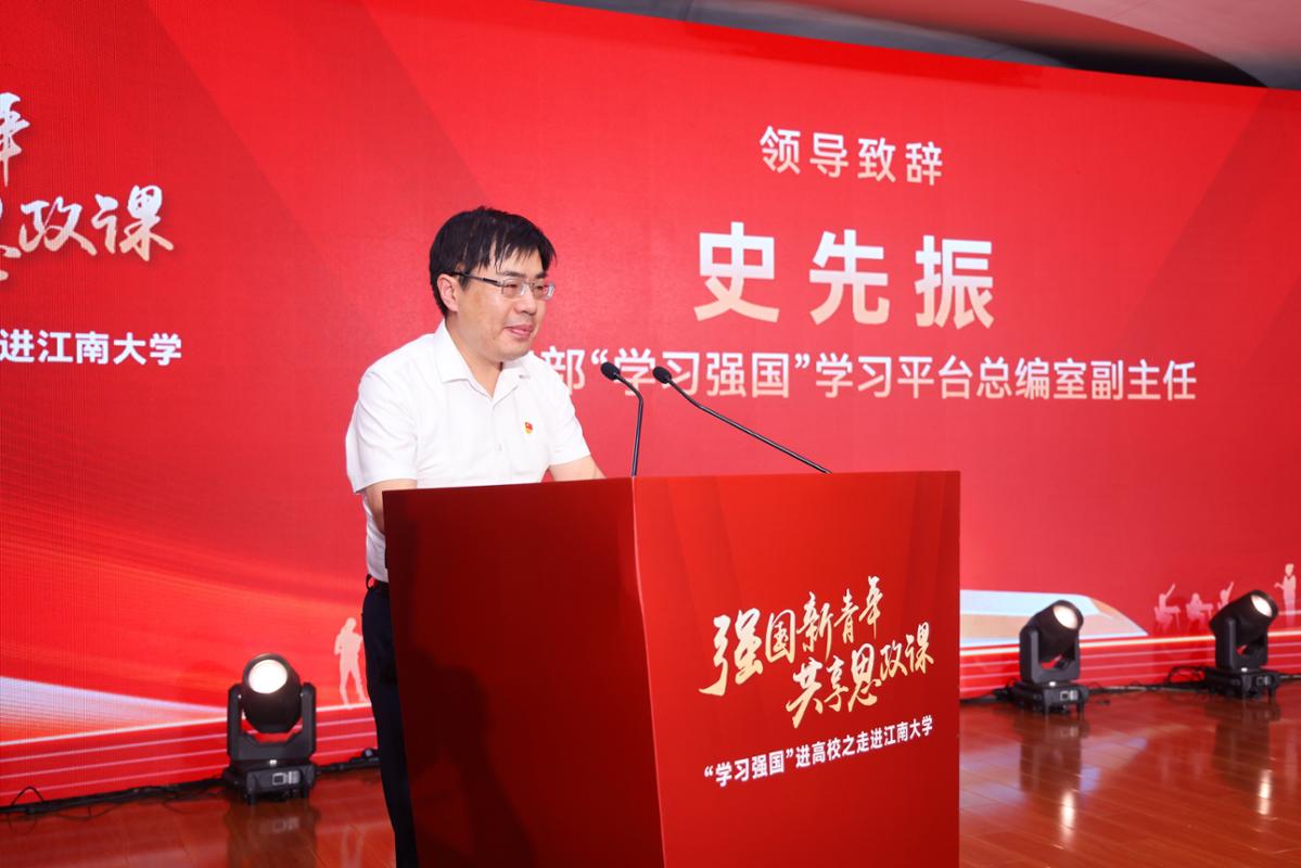 9月24日下午,强国新青年 共享思政课——“学习强国”进高校之走进江南大学活动在无锡举办。中宣部“学习强国”学习平台总编室副主任史先振,无锡市委宣传部副部长、市委网信办主任陈秋峰,中国江苏网编委、主持“学习强国”江苏学习平台工作张妍妍,江南大学党委副书记倪松涛,太湖湾高校媒体融合共享联盟25所成员单位代表,以及学校主办单位、相关单位负责人和各学院师生代表出席活动。