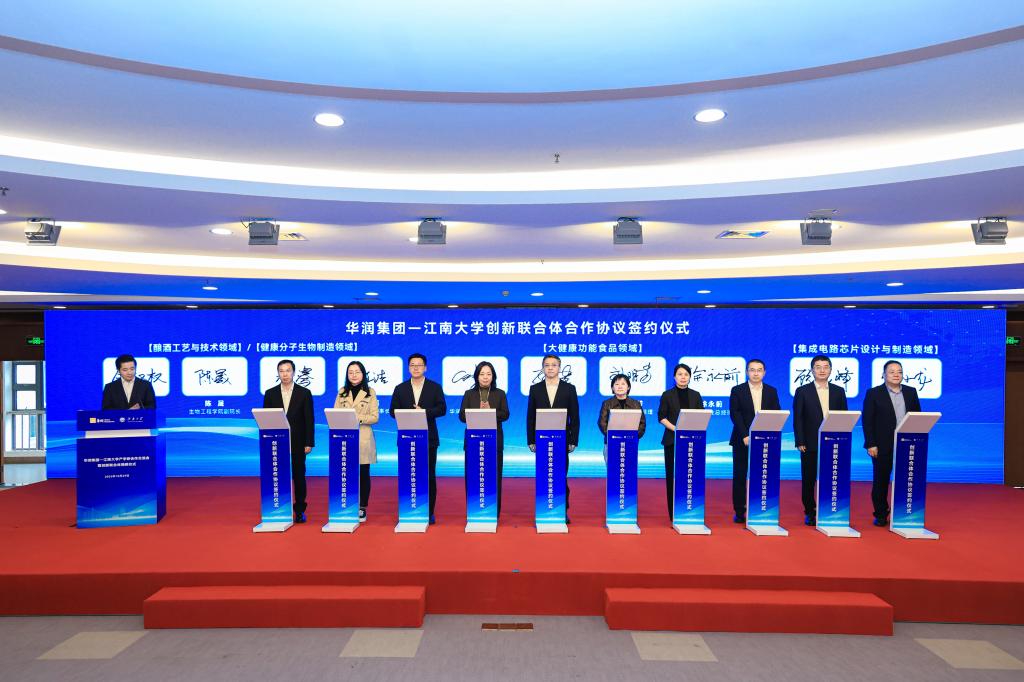 此前,华润集团与江南大学已组建6大产业“先锋队”,携手在科研创新、产业转化等方面开展深度合作:华润医药旗下东阿阿胶与江南大学共建联合创新实验室,截止当前已签署合作项目16个,全力推进桃花姬、阿胶速溶粉、阿胶燕窝等核心单品及保健食品新功能等的研发与创新,致力于成为行业内滋补健康的敏捷性研发创新高地。华润双鹤引入江南大学1,4-丁二胺高效生物合成菌株,破解关键原料“卡脖子”难题,将丁二胺发酵催化合成工艺在华润双鹤神舟生物进行工程化规模化应用,并实施产业化落地。华润微电子与江南大学共建的江苏省人才攻关联合体,聚焦先进MEMS智能传感技术创新,全力攻坚高端和车载MEMS智能传感器产业化等一系列关键核心技术问题,并持续推进“智能功率模块封装可靠性测试和失效机理研究”研发工作。华润啤酒携手江南大学深耕中国酒文化传承与品质提升,双方合作完成啤酒历史文化研究-啤酒消费场景中国元素应用研究、麦糟“佐酒零食”的开发研究等5项产学研合作项目。华润五丰联合江南大学成立联合研究实验室,积极参与由江南大学牵头并已获科技部立项的国家重点研发计划,承担《营养强化型工程化谷物食品开发与产业化示范》子课题,积极推进江西省地方标准制订服务项目。华润江中作为江南大学就业最佳战略合作伙伴,在大学生就业、校企合作等方面主动联动,为后续人才联合培养奠定基础。