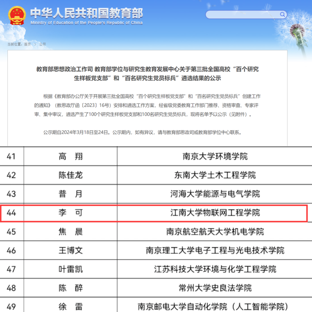 控制科学与工程专业2021级博士研究生李可入选第三批全国高校“百名研究生党员标兵”
