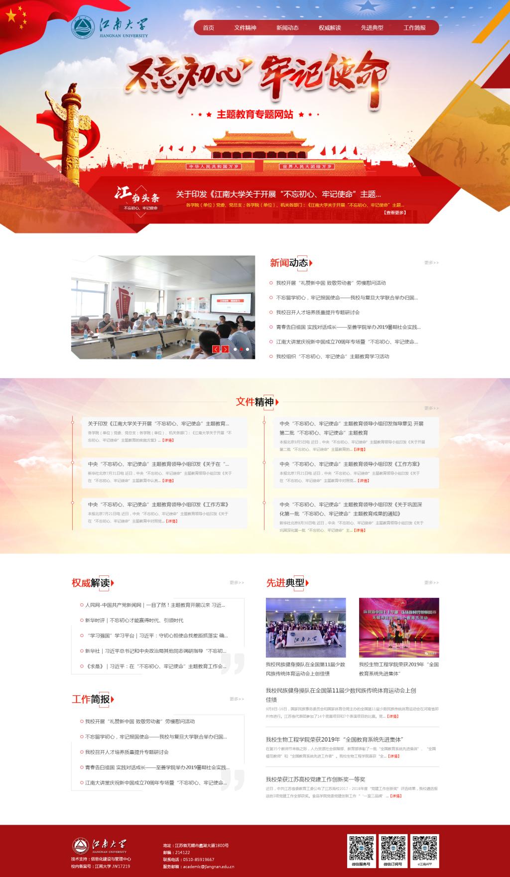 9月12日下午,我校在图书馆五楼报告厅召开“不忘初心、牢记使命”主题教育动员部署会,随后,各类主题教育活动在全校范围有序展开。为深入学习宣传习近平总书记关于主题教育的重要论述,深入宣传中央开展主题教育的重要精神,及时发布学校主题教育进展成效,校党委宣传部制作了“不忘初心、牢记使命”主题教育专题网站(http://jnbwcx.jiangnan.edu.cn/),并于2019年9月25日正式上线。