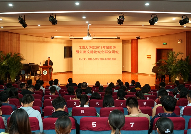 10月29日下午,江南大讲堂2019年第四讲暨江南文脉论坛之群众讲坛在北区活动中心音乐厅举行。第十三届全国政协委员、文史和学习委员会副主任,中国人民大学博士生导师叶小文为江南学子带来了一场题为“阳明心学对现代中国的启示”的精彩讲座。校党委副书记戴月波主持讲座,并为叶小文颁发“江南大讲堂讲座教授”纪念牌。