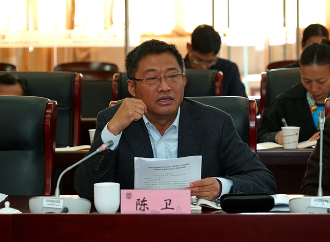 校党委常委、副校长陈卫随后领学了习近平总书记关于扶贫工作的重要论述。陈卫指出,党的十八大以来,以习近平同志为核心的党中央把脱贫攻坚摆到治国理政的突出位置。目前,75所直属高校已经全部投入扶贫工作。可以说,扶贫工作将是学校一项非常重要的政治工作,我校一是要统一部署,加强顶层设计;二是要树立“大扶贫”格局,完善工作机制;三是要整合内部资源,推进立体帮扶。站在新的历史起点,教育战线更要强化责任担当,以高度的政治责任感和社会责任感切实落实各项帮扶任务,推动精准脱贫取得实效。