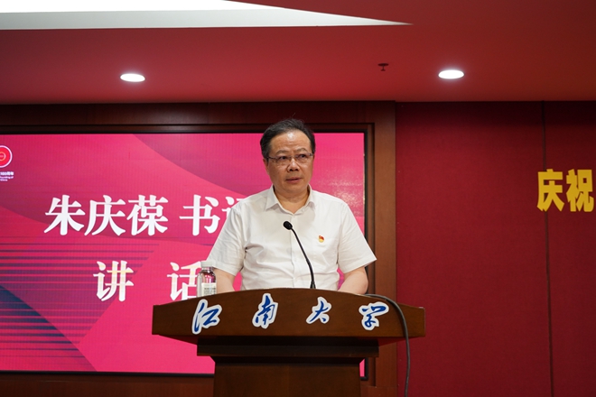 朱庆葆代表学校党委向受到表彰的优秀共产党员、优秀党务工作者和先进基层党组织表示热烈祝贺,向全校各领域各岗位上创先争优、奋斗奉献的8000余名共产党员致以节日的问候。他指出,我们党的一百年,是矢志践行初心使命的一百年,是筚路蓝缕奠基立业的一百年,是创造辉煌开辟未来的一百年。江南大学作为一所在党的领导与关怀下成立、成长起来的大学,秉承百余年优良办学传统,成为新中国首批创办的轻工业院校之一。建校63年来,学校始终与党和国家同向同行,与经济社会同频共振,为推动我国早日迈入“轻工强国”行列作出了积极贡献。