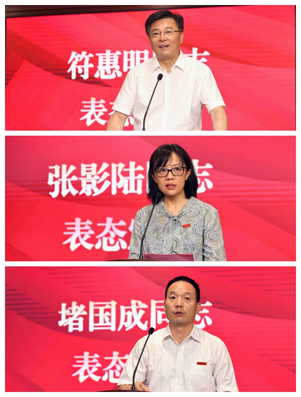 会上,三位新任职的校领导作表态发言。校党委副书记符惠明表示,将始终以永远在路上的定力讲政治,保持政治上的清醒坚定;讲勤政,恪尽职守、履职尽责;讲纪律,廉洁自律、清正廉政;讲大局,自觉维护党委领导下的校长负责制。副校长张影陆表示,将一腔忠诚向党,始终做到对党忠诚;一往无前担当,坚决扛起高质量发展的大旗;一心团结协作,最大程度凝聚发展合力;一身正气履职,处处严守纪律规矩红线。副校长堵国成表示,将强化政治意识,做政治上的明白人;加强理论学习,提升政治能力;认真履职,勇于担当;严于律己,廉洁自律,努力为学校的高质量快速发展贡献自己应有的力量。