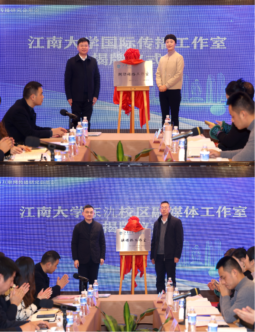 揭牌仪式上,胡振宇和外国语学院党委书记李荣华共同为江南大学国际传播工作室揭牌。蔡锦山和宜兴研究生院管理办公室主任杨延共同为东氿校区融媒体工作室揭牌。
