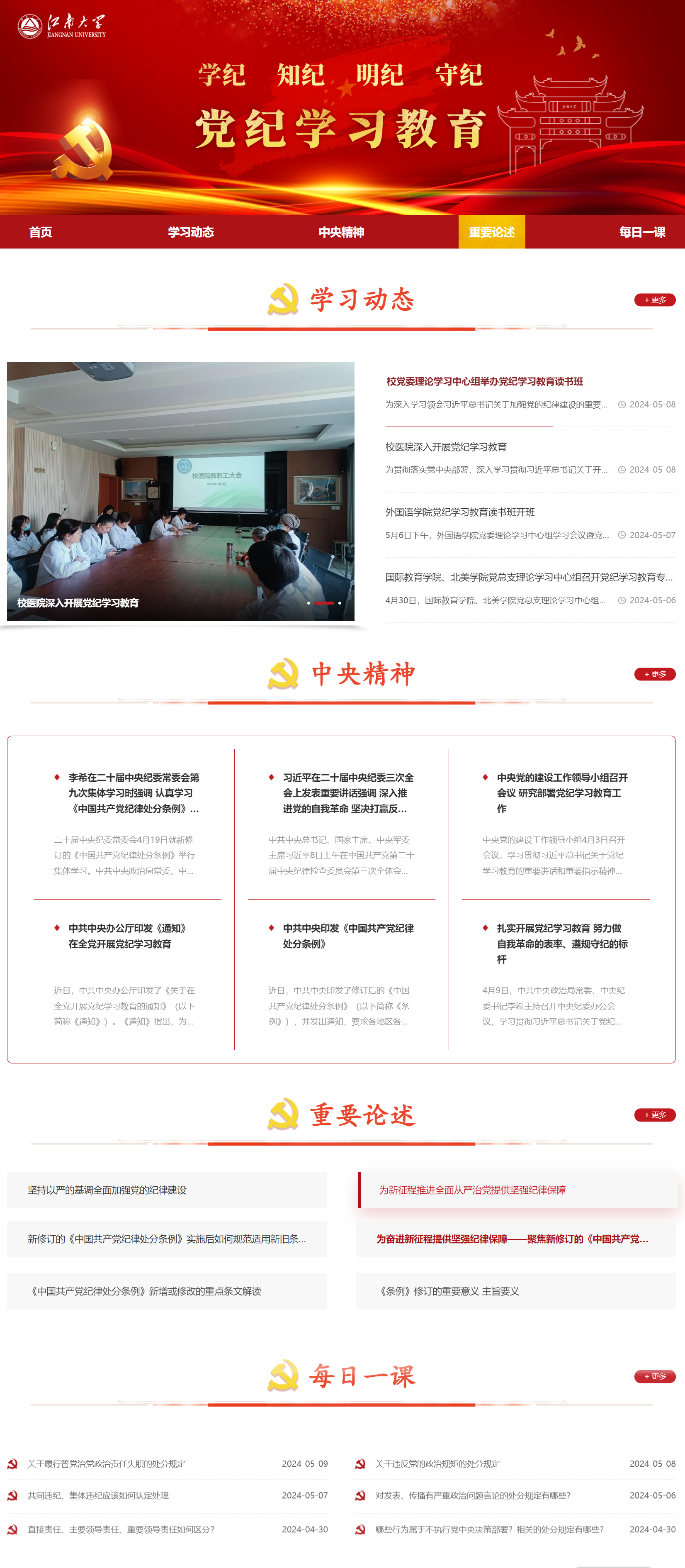 为深入学习领会习近平总书记关于加强党的纪律建设的重要论述,专题学习新修订的《中国共产党纪律处分条例》,深刻领悟“两个确立”的决定性意义,坚决做到“两个维护”,切实把思想和行动统一到党中央决策部署上来,把开展党纪学习教育作为学校的重要政治任务,高度重视、精心组织,推动党纪学习教育走深走实。近日,由学校党委宣传部、融媒体中心牵头建设,信息化建设管理处技术支持的江南大学党纪学习教育专题网站(//m.glooger.com/djzt/)正式上线运行。
