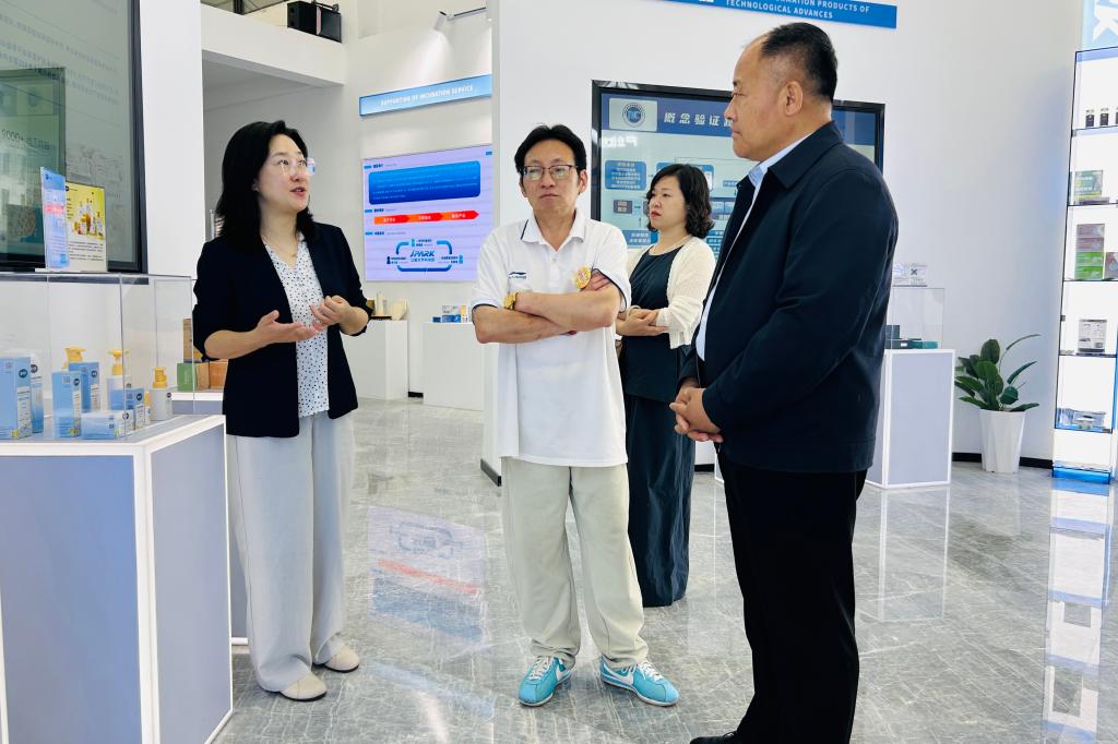 在大学科技园“江苏省概念验证中心(江南大学生命健康领域)”展厅,张翼向调研组介绍了园区的发展历程、运营模式及校地合作成果,重点分享了大学科技园在推进学校科技成果转化、服务市校共建支撑及科技企业培育等方面的实践及成果。