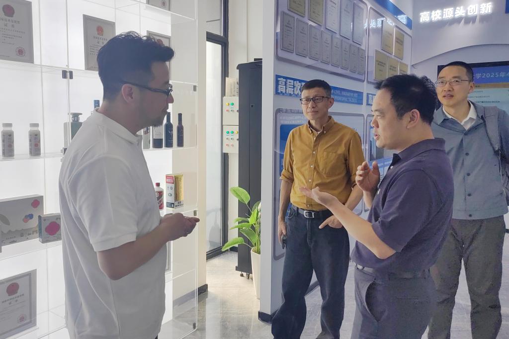 蔡澍一行参观了大学科技园“江苏省概念验证中心(江南大学生命健康领域)”展厅。李博介绍了大学科技园在生命健康领域的成果转化案例以及在成果转化、校地合作和企业孵化方面的实践成效,重点介绍了江南大学合成生物学、生物医药、健康食品等领域的创新实力及科技成果转化能力。