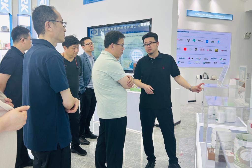 在大学科技园“江苏省概念验证中心(江南大学生命健康领域)”展厅,李博向调研组介绍了江南大学国家大学科技园在生命健康领域的成果转化案例以及在成果转化、校地合作和企业孵化方面的实践成效,重点介绍了江南大学合成生物学、生物医药、健康食品等领域的创新实力及科技成果转化能力。