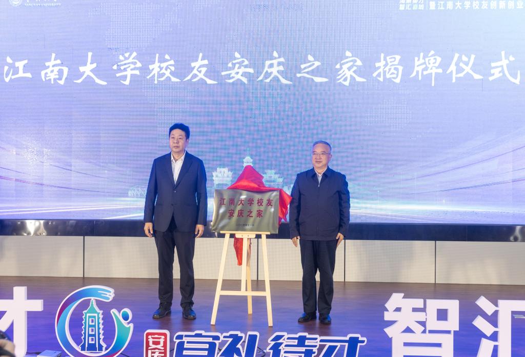 李明月和倪松涛共同为江南大学校友安庆之家揭牌。江南大学校友安庆之家的成立,是江南大学校友在安庆的温暖港湾,将为天下江南人搭建了在安庆市交流思想、分享经验、共谋发展的平台。