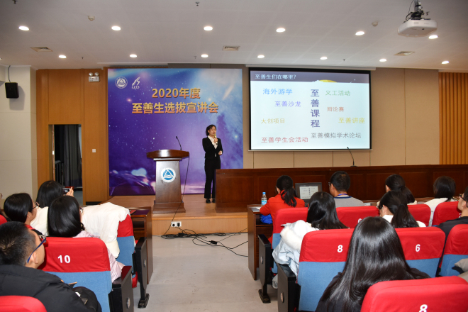 首先,至善学院副院长徐静从走进至善、认识至善、认同至善、加入至善四个方面为我们介绍了至善学院的整体情况。通过对培养理念、管理模式、教育体系、资源支持,以及同学们最关心的选拔条件、选拔安排等方面的介绍,为在场观众全方位、多层次地显现了至善学院的特色。