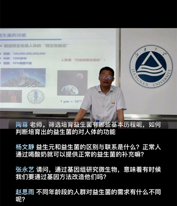 在讲座开始,陈卫对同学们在疫情防控期间以网课形式坚持学习表示赞扬与感谢。随后他从益生菌的生理特性、健康功能,以及在食品中的应用情况等方面,深入浅出地与同学们分享了益生菌的有关知识。