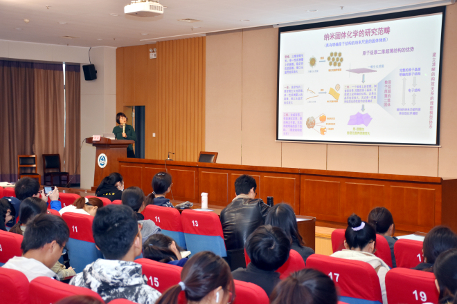 首先,谢毅教授从其科研团队的初心谈起,深入讲述了研究二维超薄材料的重要意义。她指出,原子级厚的二维超薄结构是在纳米固体化学领域中研究建立清晰的结构性能关系的最理想模型体系,相关方向的研究有望解决传统纯碳石墨烯遇到的现实难题。随后,谢毅教授介绍了该结构在合成、表征、性质等方面所面临的挑战,并辩证地讲述了由此带来的机遇。超薄二维结构的深入研究给能量转化应用领域的技术突破带来了希望,二维超薄半导体的特殊电子结构加速了能量转化过程中的电子跃迁和电子运输,其超大的比面积也提供了更高的化学活性和更多表面功能化的机会。此外,谢毅教授向同学们讲解了该结构在工业发展及实际生活中的应用。例如,该材料可应用于高性能金属—空气备用电源,与传统有机材料相比,具有安全、环保、贮存时间长、工作环境温区宽等优良性能。
