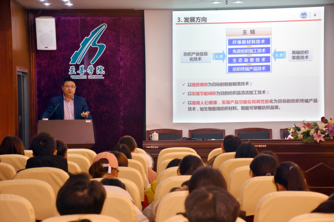 首先,付教授从纺织产业相关知识引入主题,指出其在国民经济发展中的重要地位和基本特征,提出提质增效、节能减排、产品功能化和高性能化是纺织工业的未来发展方向。随后,付教授指出,随着高新技术产业的兴起和人类环保意识的提高,创新需求成为了纺织工业的重大时代命题,现代高新技术是其多维发展的创新支撑。最后,付教授从专业的角度向同学们讲解了我国纺织产业科技发展的战略重点,未来中国纺织产业必须朝着高端化、高技术化、多元化和生态化方向发展。